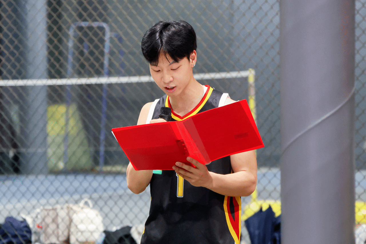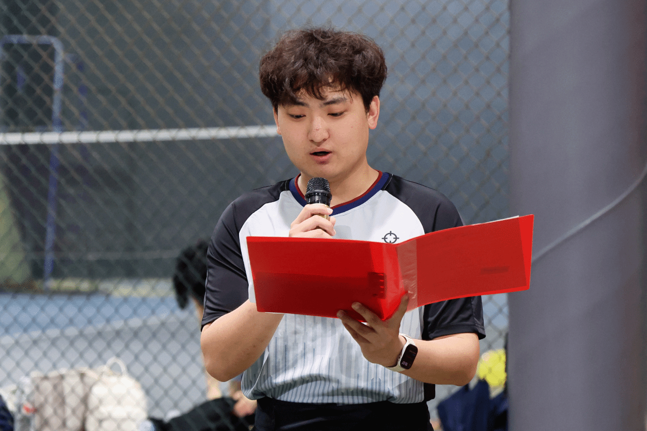 裁判员代表杨皓天同学代表全体裁判员宣誓:以体育精神为准则,以竞赛规则为依据,秉公执裁,严肃认真,为每一位运动员营造公平、公正的竞技环境,确保赛事顺利有序进行。最后,祝愿各队赛出水平、赛出风格,预祝本届校园篮球赛圆满成功。